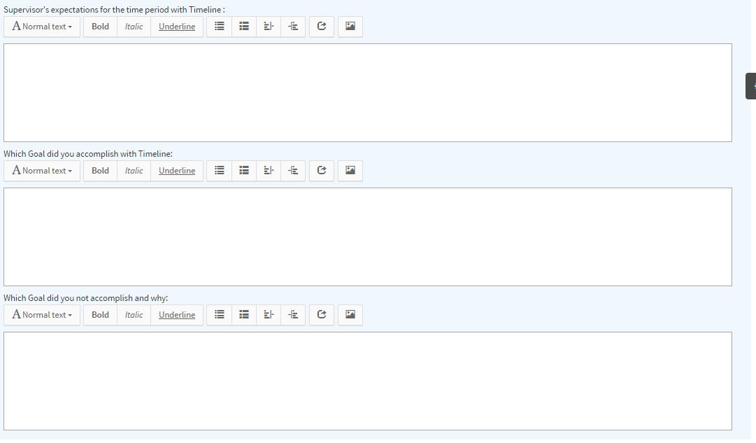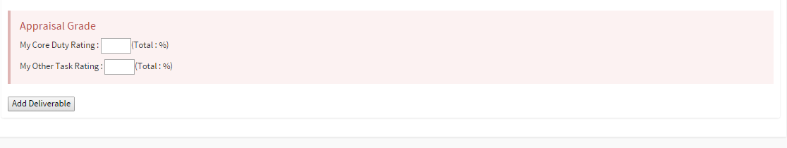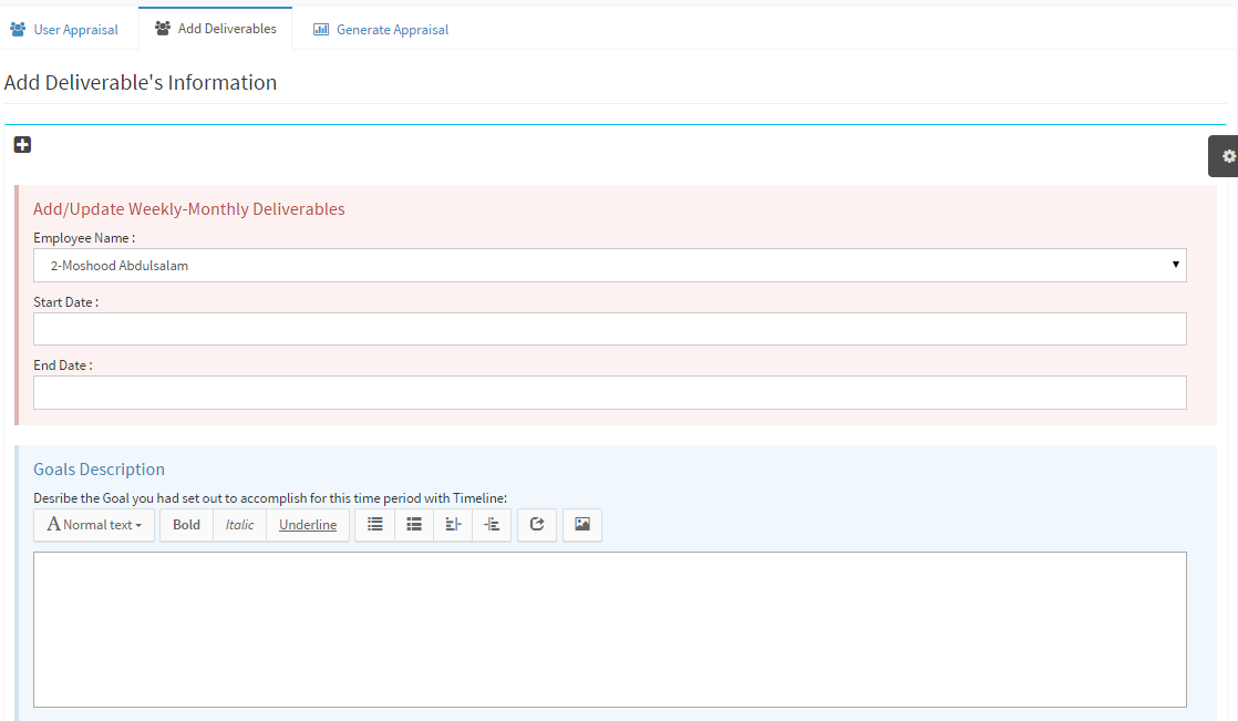 Add deliverables sub-module to be completed by user/employee and approved by supervisor(in approval level) who is usually Head of department Fill the following fields: Employee Name: Name of user/ employee Start Date: The start day for appraisal (usually week beginning, Monday) End Date: The end day for appraisal (usually week ending, Friday) Goals description: Month of appraisal Supervisor's Expectation(Only enabled for supervisors): The supervisor can add more to user/employee deliverables if not satisfied Which goals did you complete: List of goals among the deliverables you were able to complete Which goals did you not complete: Goals you couldn't complete with tangible reasons Appraisal Grade: Supervisor gives the final grade both in core duty and other task ranking which can be configured in Organisation>Department>Create Department |