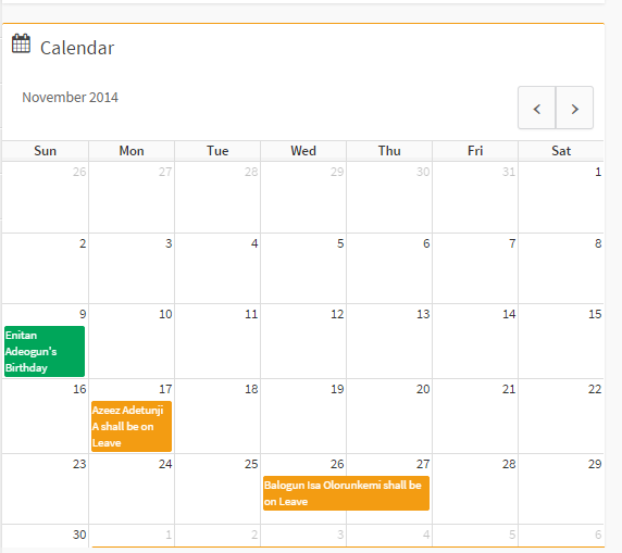 The calendar displays various events like holidays, birthday, employee leave on each day