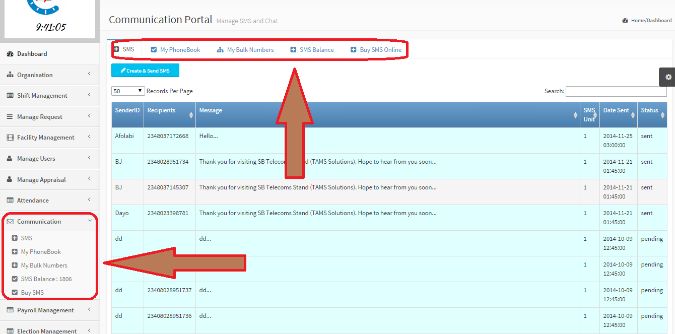 Get in touch with colleagues, family and friends with the Communication Portal Module This module includes: 1. SMS 2. My Phonebook 4. SMS Balance 5. Buy SMS |