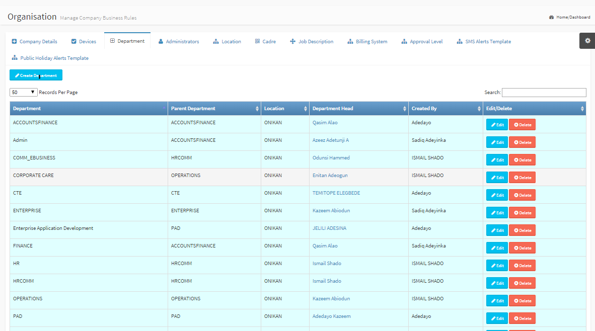 Department Tab is where the various departments in the organisations displayed in tabular manner. Department: This is the name of the department Parent Department: This is referring to the department that this department is directly under(If exist). Location: Select a Location.Create a Location in Organisation > Location Head of Department: The name of the person that would head the department. Created By: The name of the account used to create the department is automatically appended to it. |