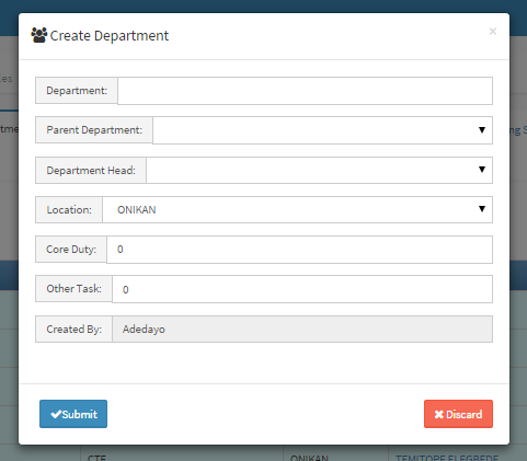 Create Department Populate the following fields to complete the form Department: Name of the department. Parent Department: Select parent department Department Head: Select HOD Location: Select a location Core Duty: Servers as a measuring standard for grading employees on their performance on primary duty. Use 80 or 90. Other task: Also an assessment standard but for non-primary tasks like attendance, involvements. Use 20 or 10. Created By: Auto appends name of logged in account. Edit/Delete: Update and Delete existing departments. Hint: The sum of Core Duty and Other task should be exactly 100. |