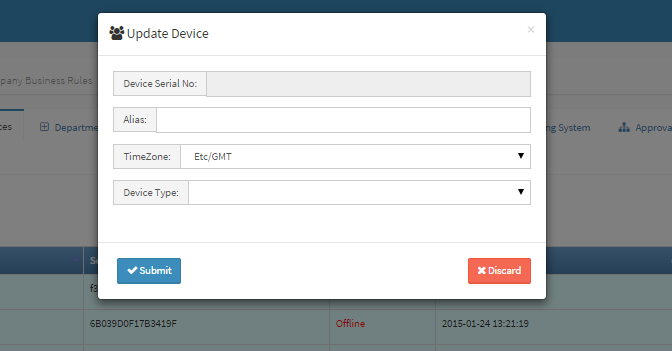 After a device had been created previously, some of its details can still be changed like Alias: A random name you can use to identify each device Time Zone: This is the serial number embedded from the OEM. Device type: Offline or Online Click on Submit button when done. |