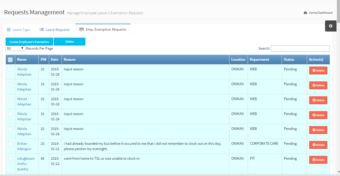 Employee Exemption Request Tab for viewing and managing individual employee's exemption. An exemption is valid for only one day unlike Leave Request, but multiple days can be selected during creation. Name: Employee name PIN: Employee PIN Date: The day to be exempted. Reason: A short explanation for requesting for exemption Location: Office location where employee works Department: Employee's department Status: Approved or Pending (reference Approval Level) Delete: Delete an existing exemption. |