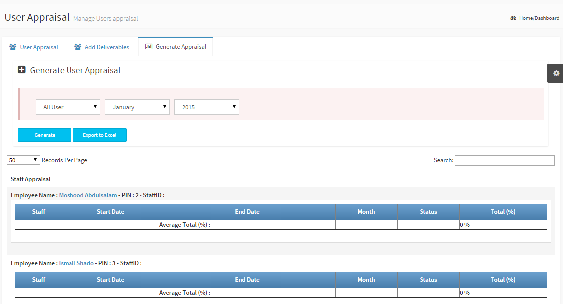 As an Admin: You can generate appraisals based on department, location and individuals for a specified month As a User/Employee: You can generate your own appraisal for any month. |