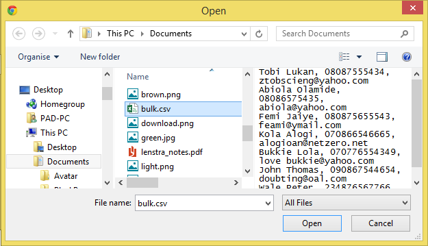 - country code appended to each number (e.g 2348023456789)