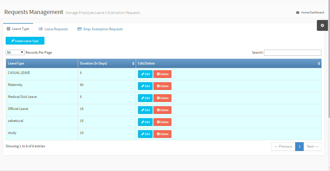 Leave Type Tab managing different categories of leave Leave Type: A name for the leave type Duration: The length of the leave in days Edit/Delete: Update or Delete an existing leave. |