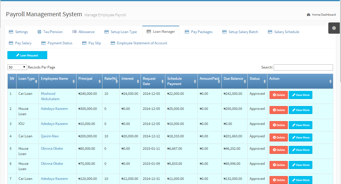 Apply for loan from this module. Loan Type: Identity of loan Employee name: Name of Employee applying for loan Principal: The main Amount been applied for. Rate: Rate over the interest (over 100) Interest : How much interest to be paid over the principal Request Date: Date employee applied for loan Schedule Payment: Amount Paid: Total amount employee has paid back Due Balance: Status: Pending or Approved Action: Delete or view entry |