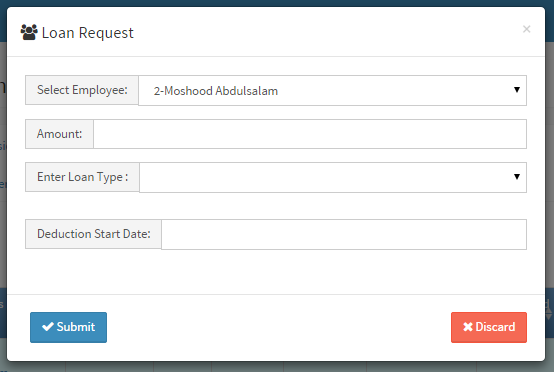 Loan Request Fill the following fields to complete the form Select Employee: Choose an employee Amount: Amount to loan out Enter Loan Type: Choose loan type Deduction Start Date: Choose when to start deducting/collecting money from employee salary. Click Submit button to complete the process |