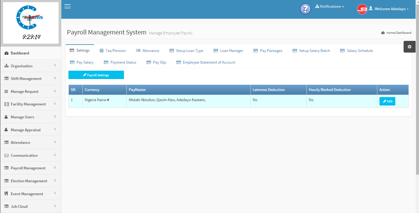 Manage payments of salary with the TAMS Payroll Management Module This module includes: 1. Setting 3. Tax/Pension 6. Loan Manager 7. Pay Packages 10. Pay Salary 11. Payment Status 12. Payslip |