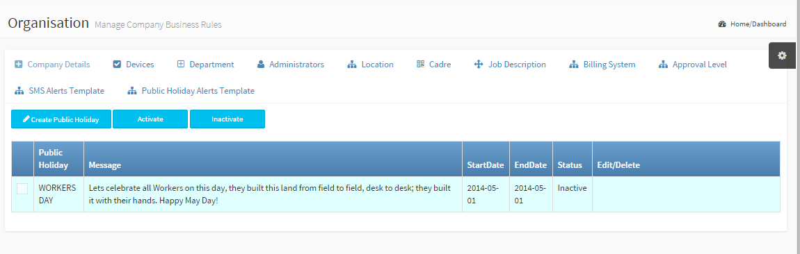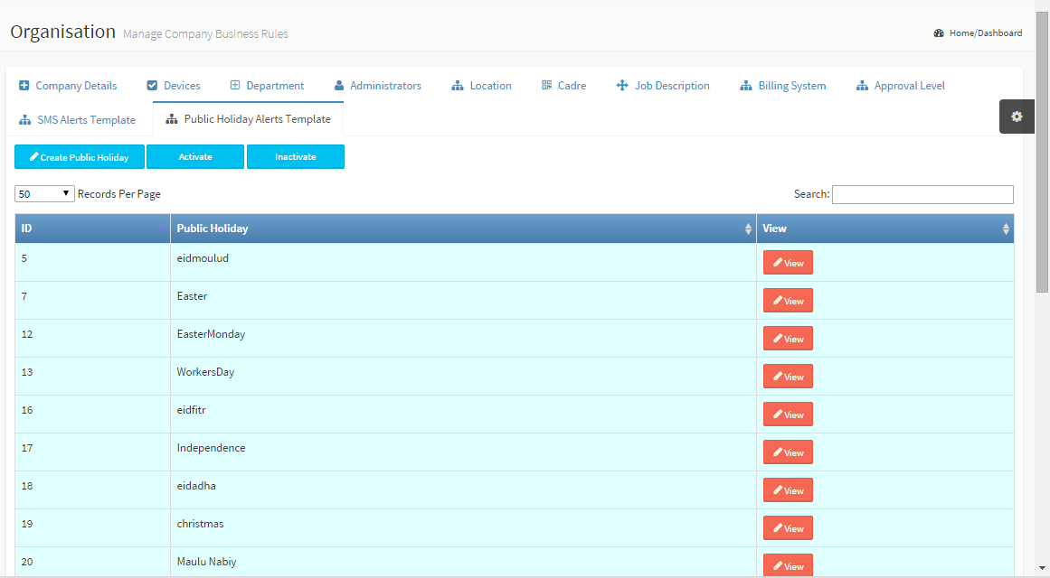 Public Holiday Alert Template Tab (just like SMS Alert Template) is the place to configure the type of notifications/messages that would would sent for during holidays You can add your own message and as well use the predefined templates. Templates you dont want to be sent/used can temporarily be disabled by marking as INACTIVE. ID: Auto generated id Alert ID: Is a group name for all alert template of that type View: Click view to display the various templates for each group |