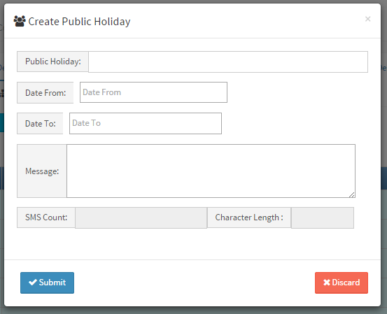 Create Public Holiday Populate the following fields to complete the form Public Holiday: Give the holiday a name Date From: When the holiday starts Date To: When the holiday ends Message: The content of the message to be sent to individuals. SMS Count: The amount of SMS unit that would be deducted per SMS sent Character Length: The number of characters in the Message body Click Submit button to complete the process |