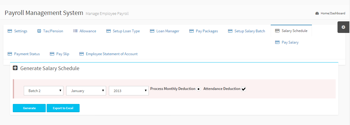 Generate a schedule of staff salary in batches month by month. You can choose to deduct for attendance by checking the rightmost checkbox |