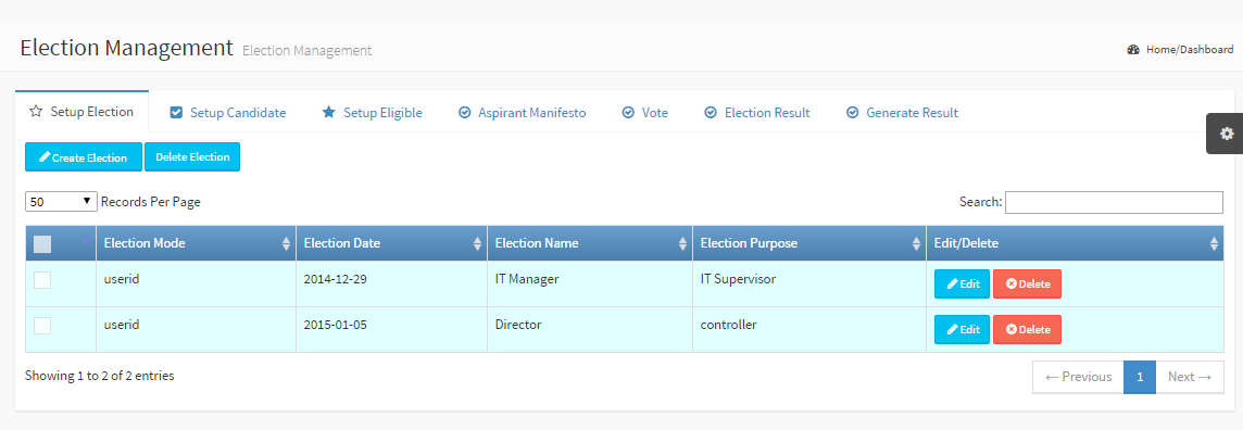 Setup an Election Election Mode: The means by which the election would be conducted Election Date: The day one can vote Election Name: A name for that election Election Purpose: A short reason/description for the election Edit/Delete: Modify or delete an existing election |