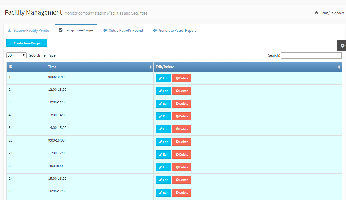Create and View all the possible time ranges that are applicable for your own Facility Management in the Setup Time range sub-module Time: Starting and Ending time expected for that round Edit/Delete: Update or Delete existing time ranges. |