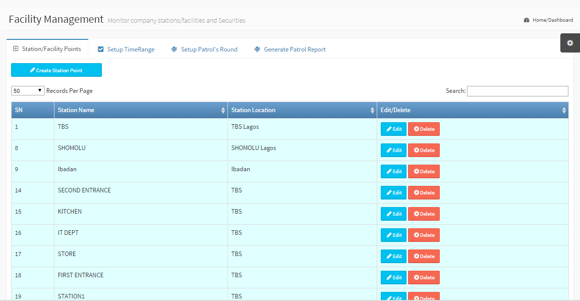 Station/Facility Point is the sub-module for creating and viewing all the points that facilities are situated Station Name: A name for the point Station Location: The location for the facilities Edit/Delete: Update or Delete existing points. |