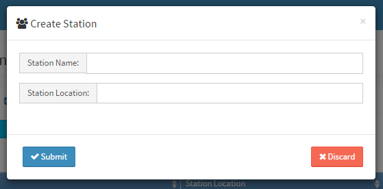 Create Station Fill the following fields to complete the form Station Name: A name for the station Station Location: Where is/are the facilit(y/ies) located Click Submit button to complete the process |