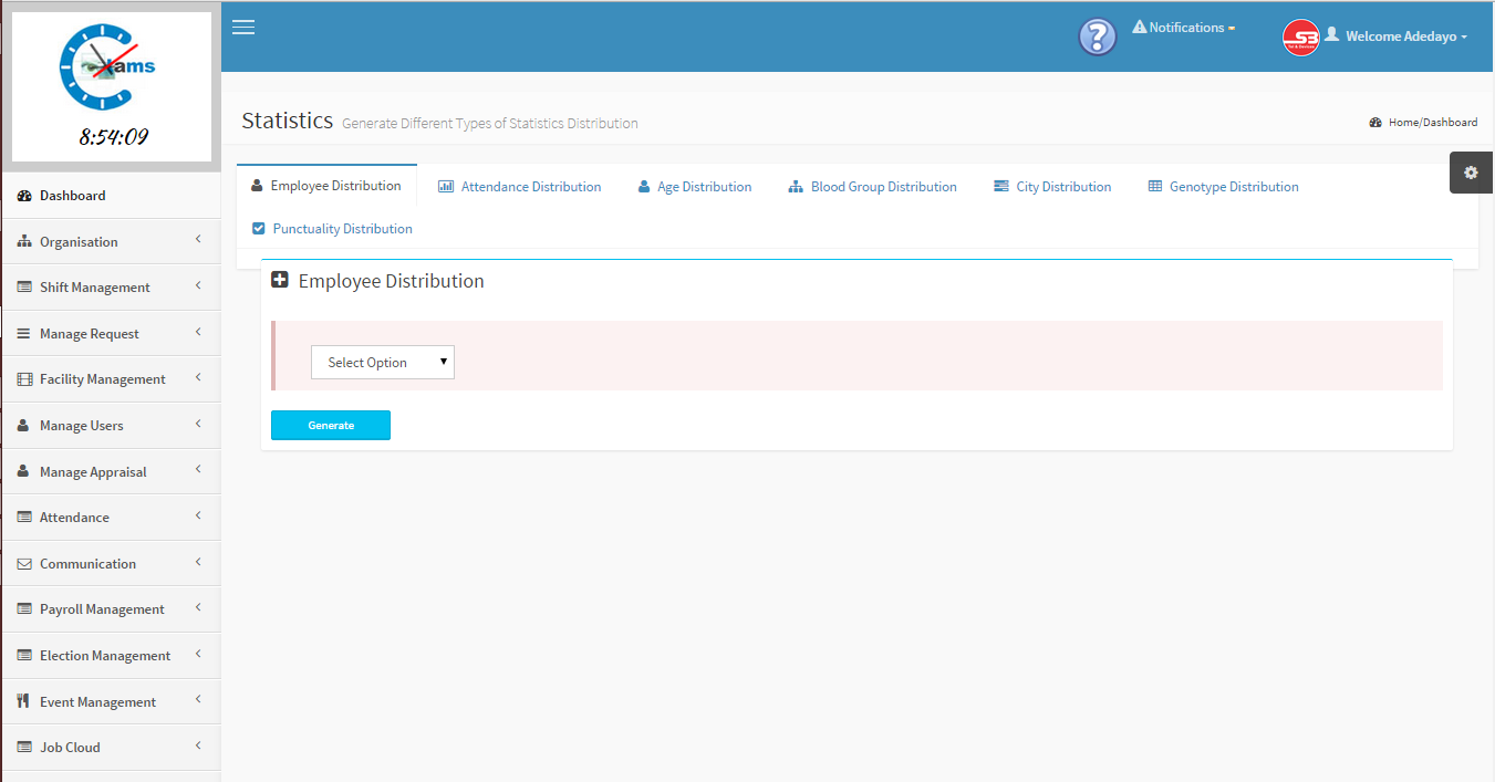 Generate graphical representation of data on: Employee Distribution Attendance Distribution Age Distribution Blood Group Distribution City Distribution Genotype Distribution Punctuality Distribution Use the filter and select your choice then generate