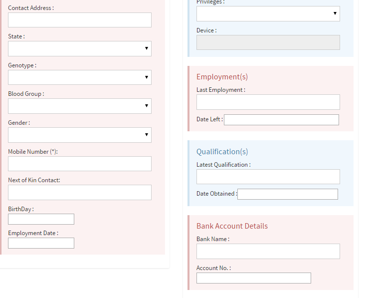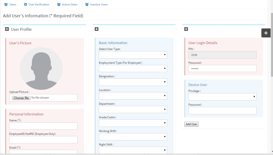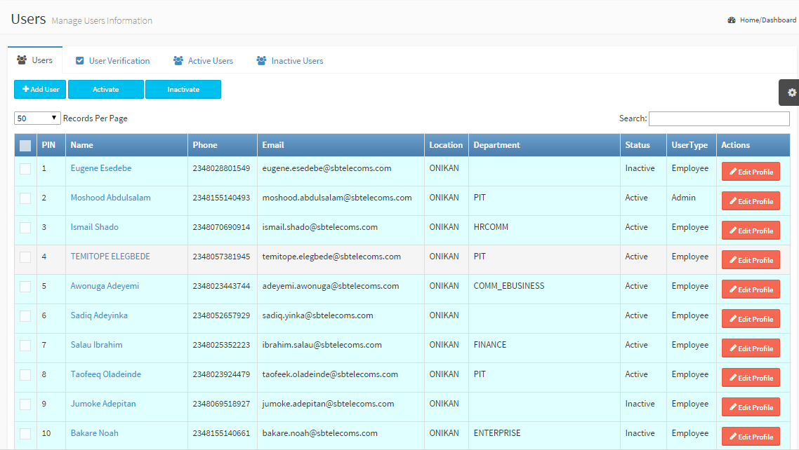 Manage all the users in your company in the User sub-module PIN: An auto generated unique staff identification number on TAMS Name: Staff name Phone: Phone number (most appropriate 2348061234567) Email: Employee email Location: His office location Department: His department Status: Active or Inactive User type: Employee, Admin, ... Action: Update existing profiles. |